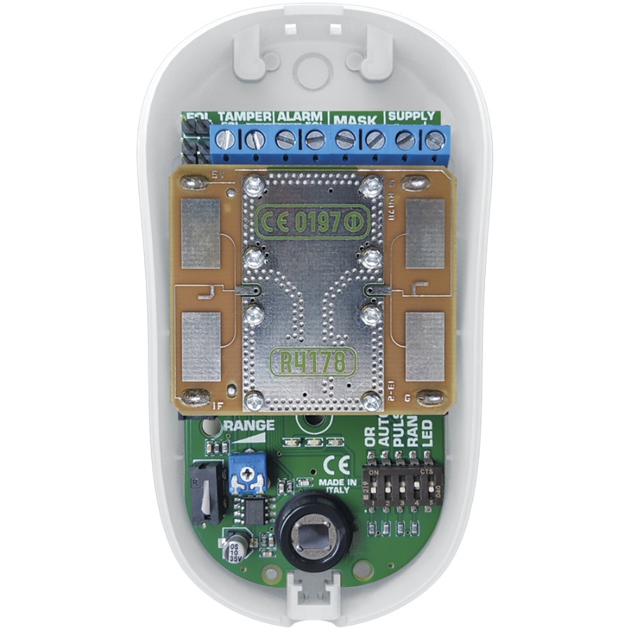 | Detection test | AvailablePIR (flashing green led)Microwave (blinking yellow led) |