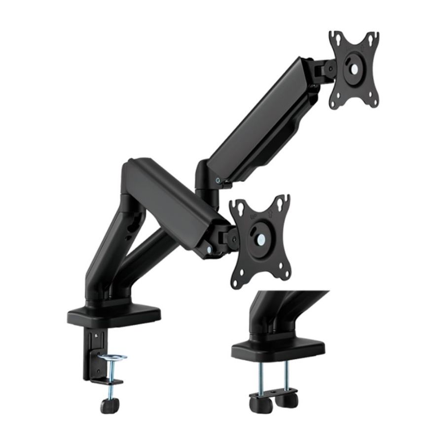 Dvokraki stolni stalak za monitor je dodatak dizajniran za ergonomsko podupiranje i podešavanje dvaju monitora. Pričvršćuje se na rub ili površinu stola pomoću podnožja ili stezaljke i omogućuje slobodno pomicanje monitora u različitim smjerovima: visina, nagib, rotacija i udaljenost.