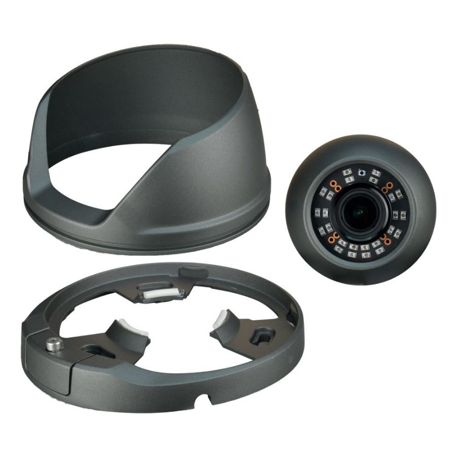 Kućište je izrađeno od aluminija i otporno je na vremenske uvjete prema protokolu IP66, što ga čini prikladnim za unutarnju i vanjsku upotrebu. Ima tri osi (3AXIS) koje omogućuju jednostavno i precizno podešavanje kuta gledanja, s montažom na strop ili zid. Uključuje vijak koji spaja bazu sa strukturom kamere, za jednostavnu montažu.