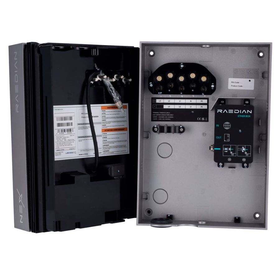 | Upravljanje opterećenjem | Izravno na CT stezaljku (dinamičko uravnoteženje opterećenja) Certificirani vanjski mjerač (dinamičko uravnoteženje opterećenja s viškom solarne energije) s RS485 Backend s OCPP-om Statičko upravljanje opterećenjem putem RAEDIAN aplikacije |