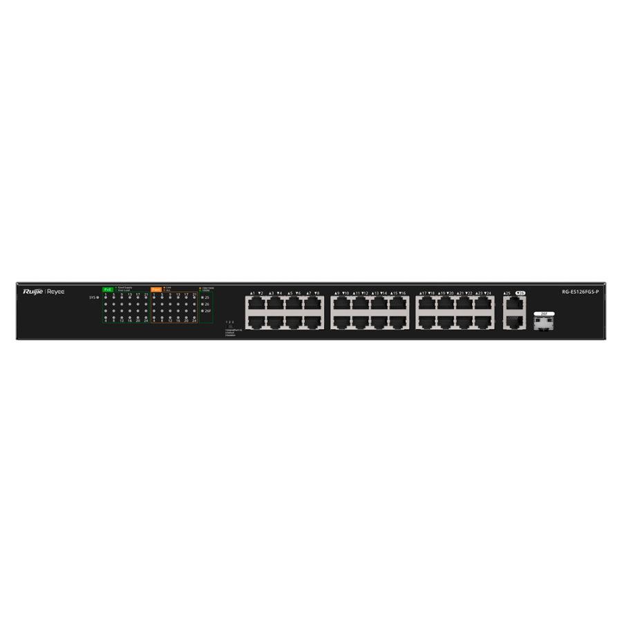 | Interface | 24 Ports RJ45 10/100Mbps1 Port RJ45 10/100/1000Mbps1 Port SFP/RJ45 Combo (either the SFP port or the RJ45 port can be used, but not both at the same time) |