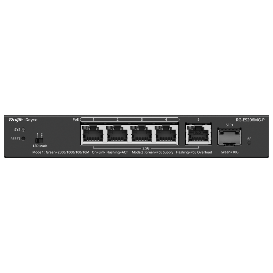Ruijie Reyee RG-ES206MG-P je 2-slojni upravljani prekidač s 2,5G, multigigabitnim 10GbE priključcima, SFP+ priključkom i PoE+ na svim priključcima; isporučuje do [%VAR%] ukupnih W za napajanje IEEE [%VAR%] uređaja. Nudi besplatno upravljanje putem oblaka, jednostavnu konfiguraciju putem web sučelja i aplikacije te je idealan za iskorištavanje Wi-Fi 7 i maksimiziranje performansi u uredskim mrežama ili projektima malih poduzeća. Njegov bešumni dizajn čini ga tihim, omogućuje postavljanje na stol ili na zid te ima naprednu zaštitu napajanja i značajke kao što su VLAN, izolacija priključaka i DHCP snooping za sigurnost i učinkovitost.