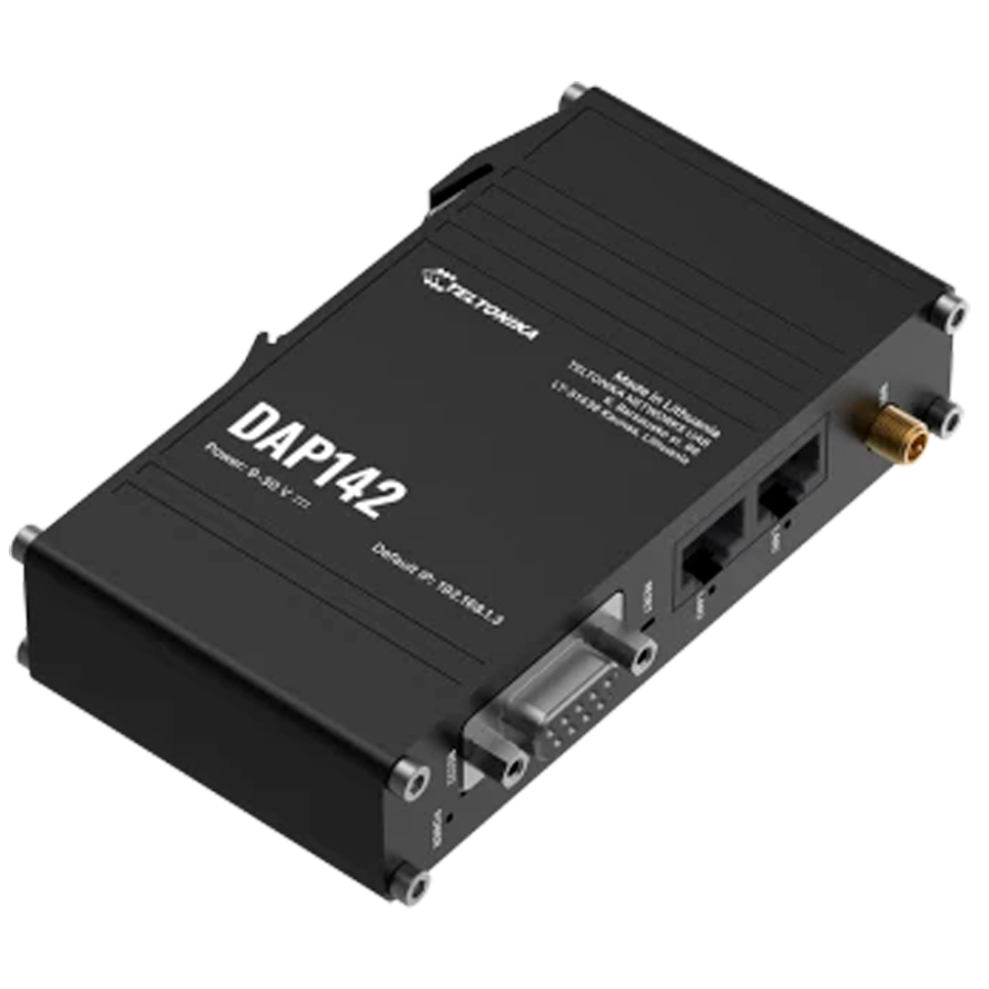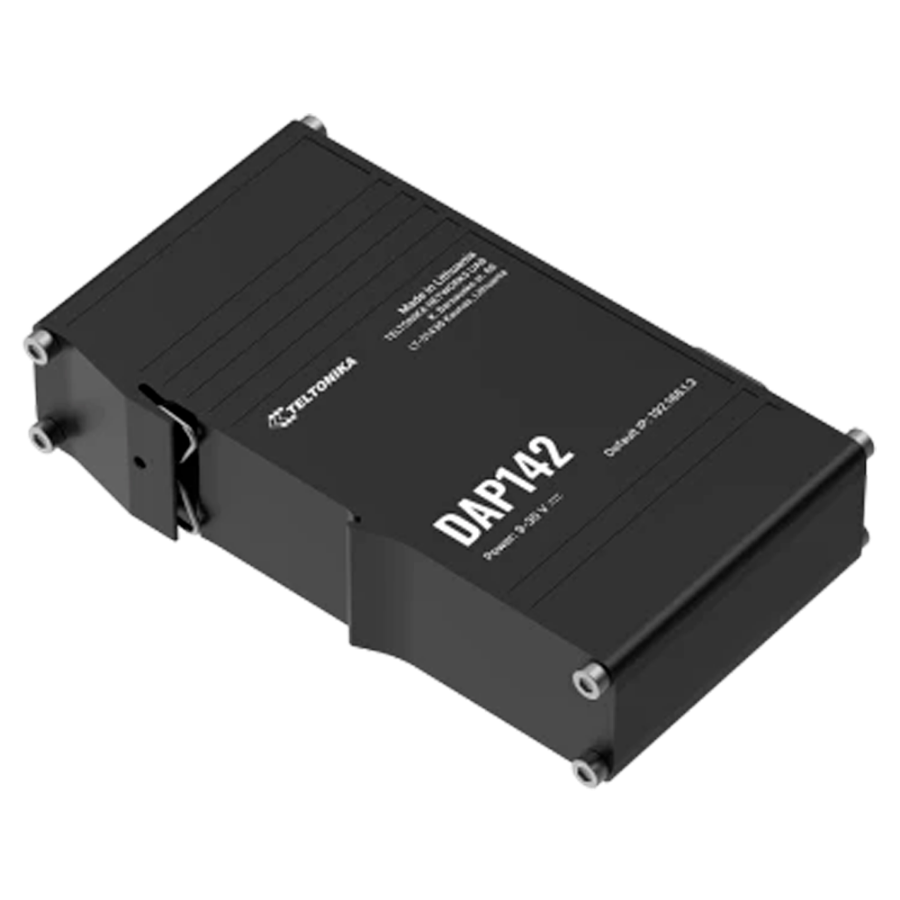 The Teltonika DAP142 is an industrial Wi-Fi access point designed to provide robust and reliable wireless connectivity in demanding environments. Its rugged design, with aluminum housing and DIN rail bracket, makes it ideal for industrial applications requiring durable and secure installation. This device is particularly useful in smart factories and industrial automation environments, where the interconnection of equipment is essential. Thanks to its support for Wi-Fi Mesh and Fast Roaming, it enables continuous and uninterrupted wireless coverage, facilitating the mobility of devices and operators within the plant. A distinguishing feature of the DAP142 is its RS232, port that allows direct connection to key industrial equipment, such as robotic arms and human-machine interfaces (HMI), facilitating the integration of legacy devices into the modern network. In addition, the DAP142 supports up to 50 simultaneous connections, making it suitable for environments with high device density. Its power supply through a 3 pin connector adapted for industrial use and its plug-and-play functionality simplify its implementation and configuration.